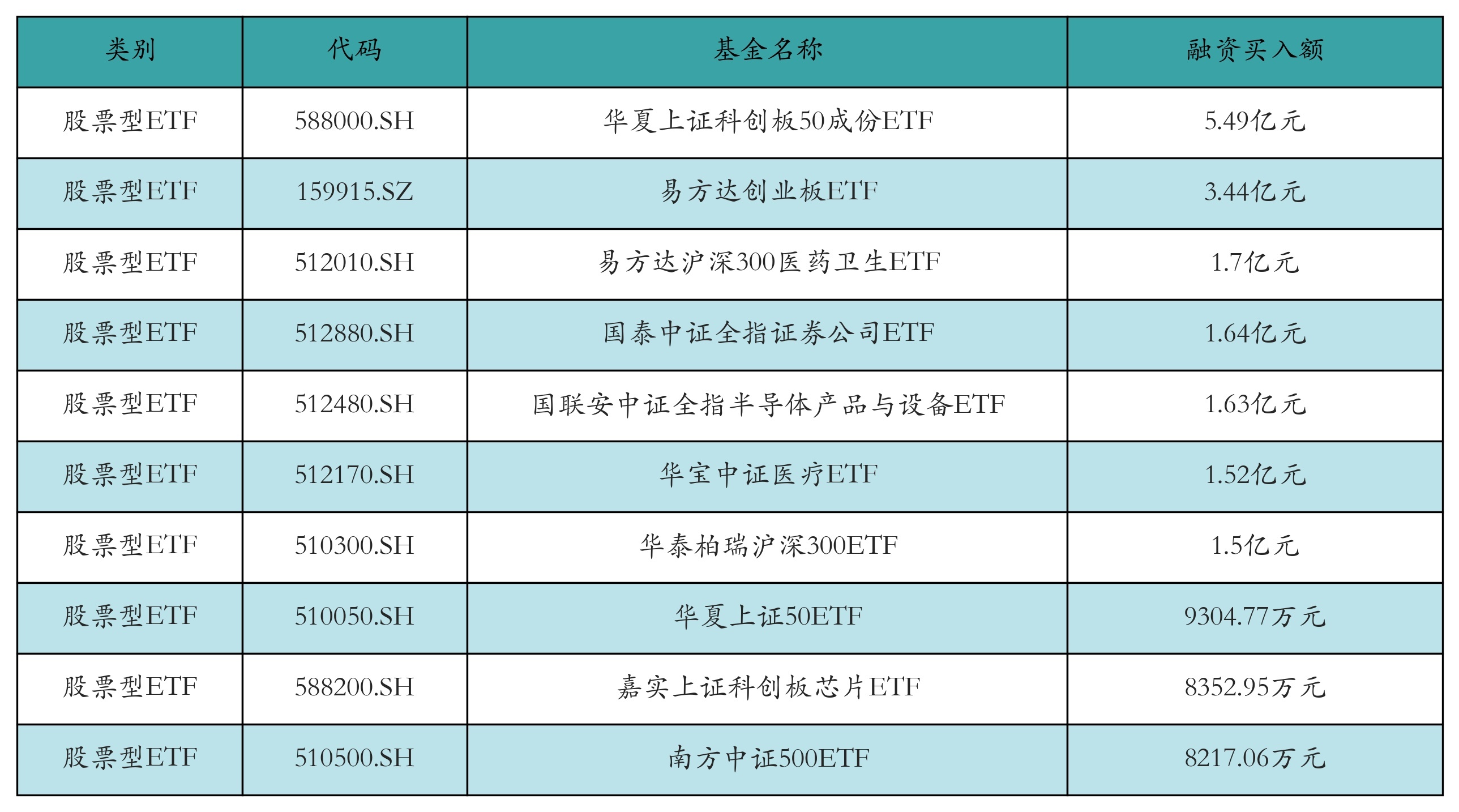 昨日股票型ETF融资买入额最高的3支ETF及其买入金额分别为:华夏上证科创板50成份ETF(5.49亿元)、易方达创业板ETF(3.44亿元)、易方达沪深300医药卫生ETF(1.7亿元)。融资买入额前10详情见下表: