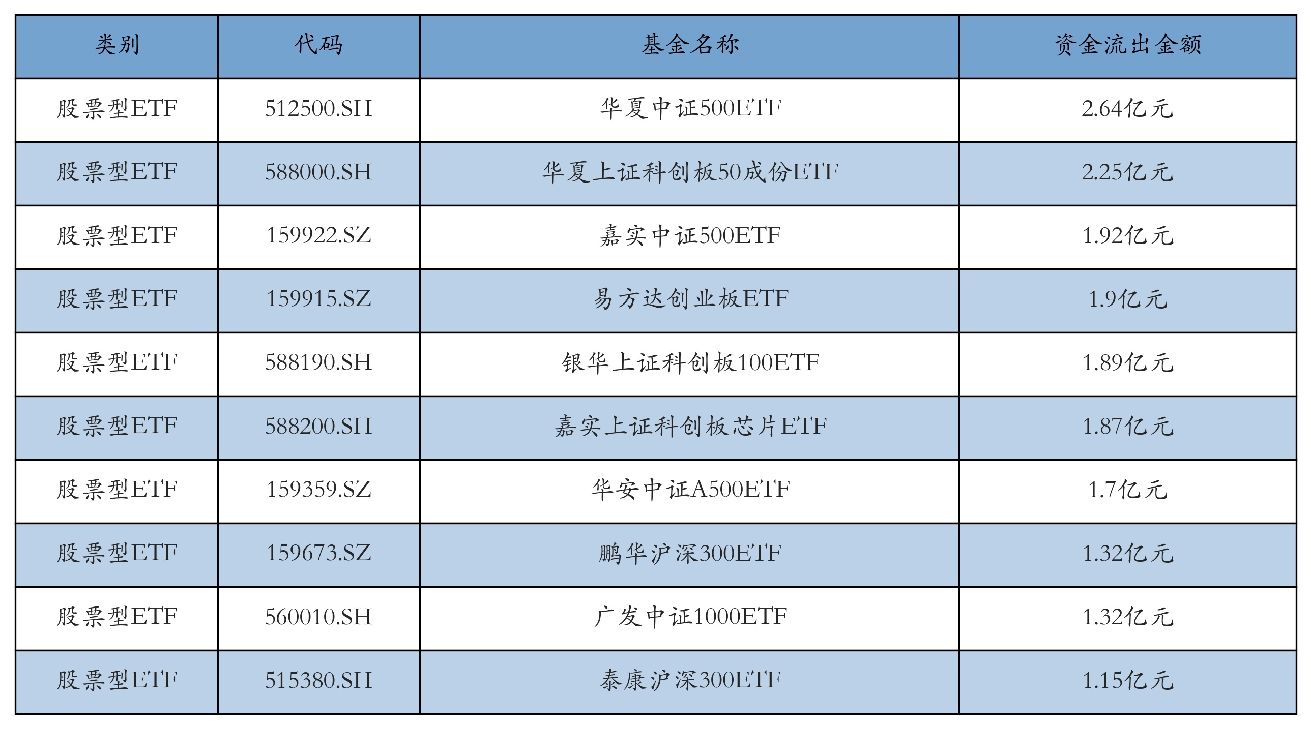 昨日股票型ETF资金流出最多的3支ETF及其流出金额分别为:华夏中证500ETF(流出2.64亿元)、华夏上证科创板50成份ETF(流出2.25亿元)、嘉实中证500ETF(流出1.92亿元)。资金流出前10详情见下表: