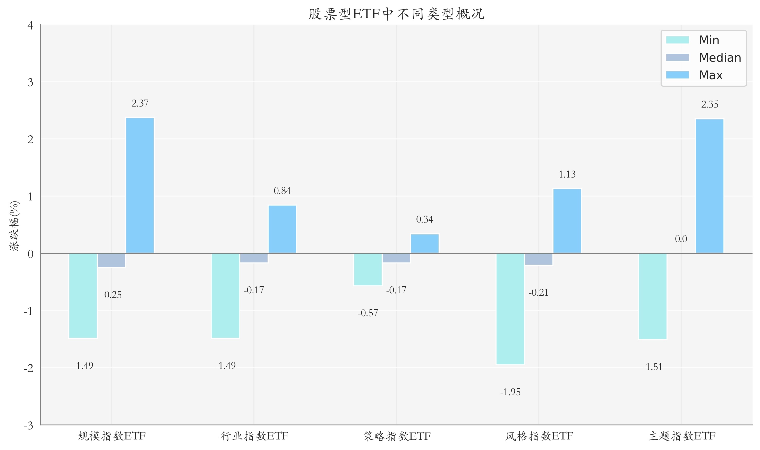 昨日股票型ETF收益率中位数为-0.12%。其中按照不同分类,规模指数ETF中海富通中证2000增强策略ETF收益率最高,为2.37%;行业指数ETF中国泰中证800汽车与零部件ETF收益率最高,为0.84%;策略指数ETF中前海开源中证500等权重ETF收益率最高,为0.34%;风格指数ETF中广发上证科创板成长ETF收益率最高,为1.13%;主题指数ETF中富国中证稀土产业ETF收益率最高,为2.35%。