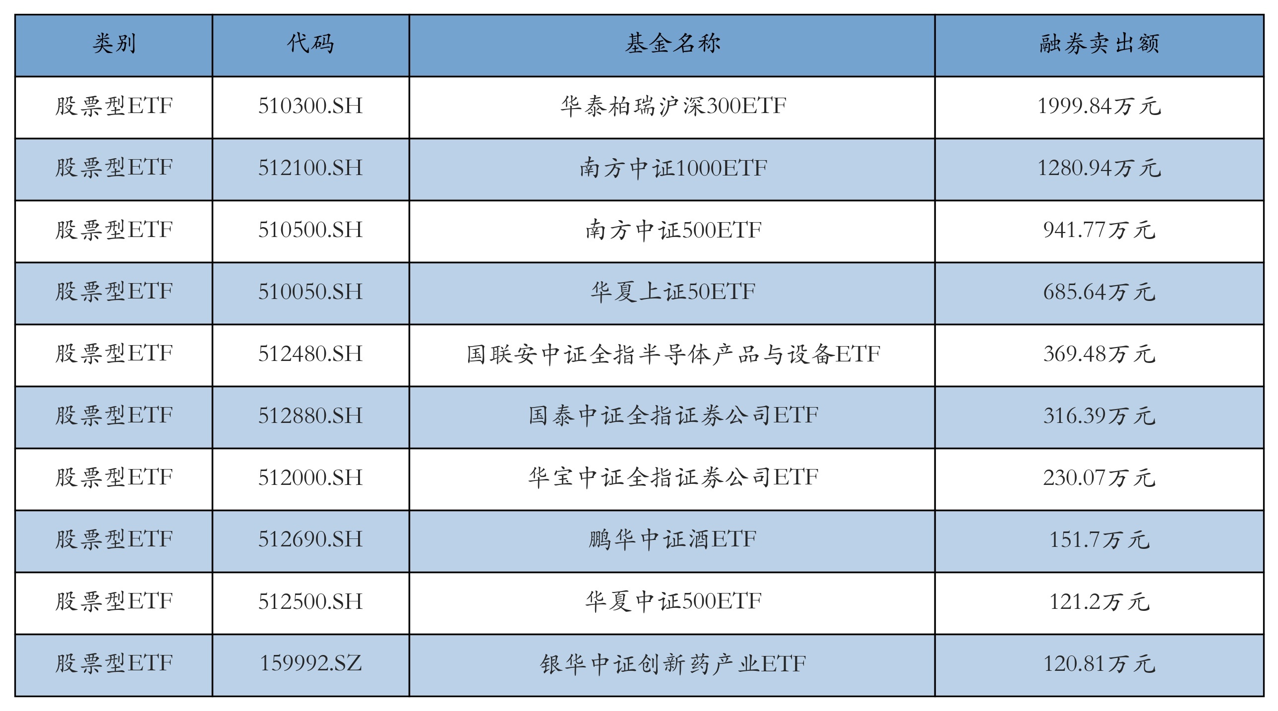 昨日股票型ETF融资卖出额最高的3支ETF及其卖出金额分别为:华泰柏瑞沪深300ETF(1999.84万元)、南方中证1000ETF(1280.94万元)、南方中证500ETF(941.77万元)。融券卖出额前10详情见下表: