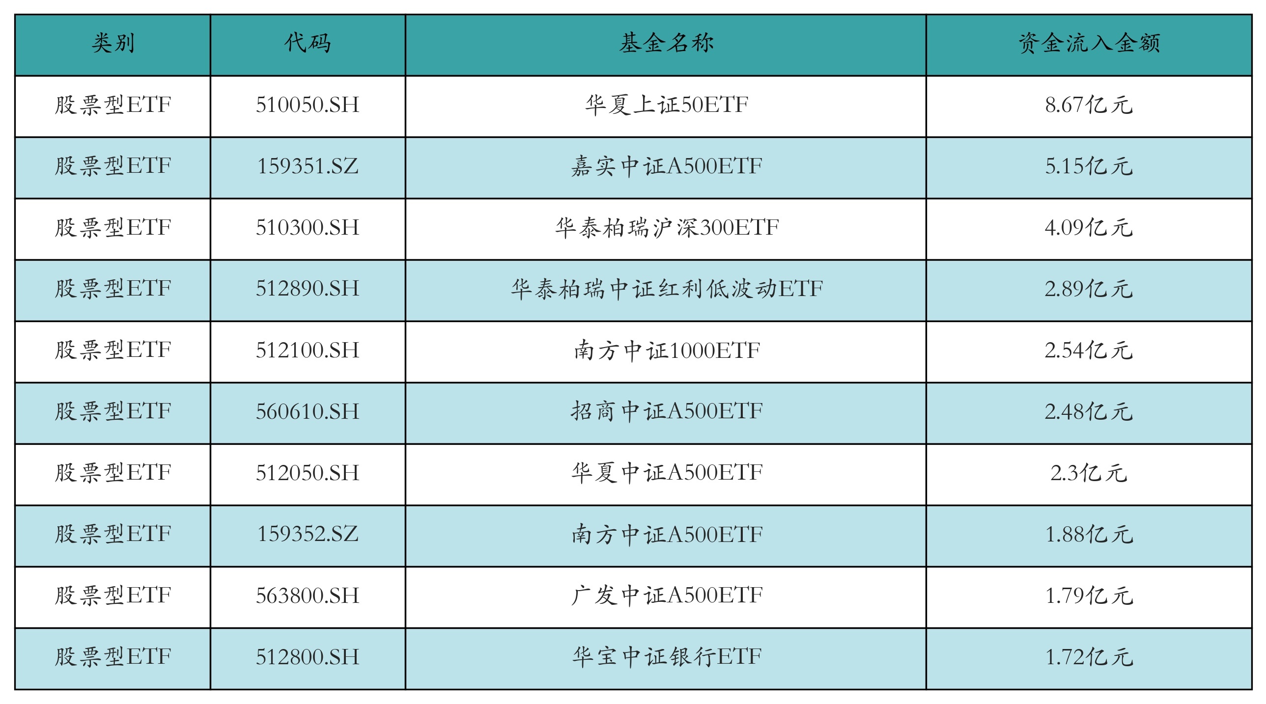 昨日股票型ETF资金流入最多的3支ETF及其流入金额分别为:华夏上证50ETF(流入8.67亿元)、嘉实中证A500ETF(流入5.15亿元)、华泰柏瑞沪深300ETF(流入4.09亿元)。资金流入前10详情见下表: