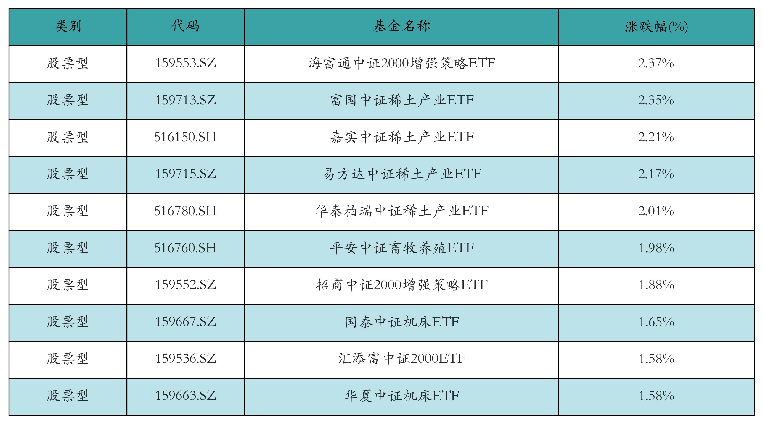 昨日股票型ETF涨幅最高的3支ETF及其收益率分别为:海富通中证2000增强策略ETF(2.37%)、富国中证稀土产业ETF(2.35%)、嘉实中证稀土产业ETF(2.21%)。涨幅前10详情见下表: